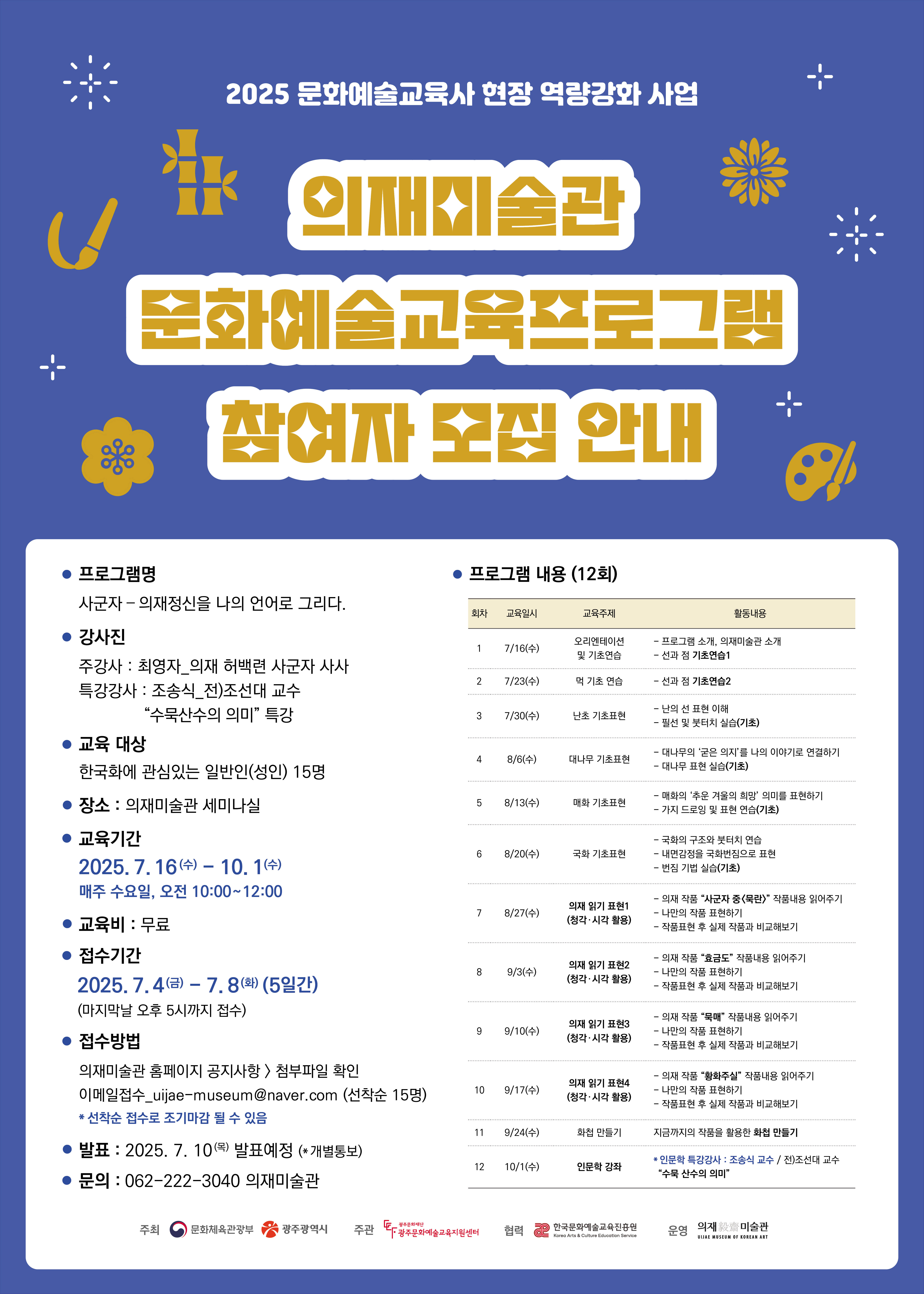 의재미술관이 한국화와 사군자에 관심 있는 성인을 대상으로 ‘사군자: 의재의 정신을 나의 언어로 그리다’ 프로그램을 운영한다. 이번 과정은 7월 16일부터 10월 1일까지 매주 수요일 오전 10시부터 정오까지 의재미술관 세미나실에서 총 12회 진행된다.교육은 난초·대나무·매화·국화 등 사군자의 상징을 이해하고 직접 그려보는 실기 수업으로 구성된다. 참가자는 의재 허백련의 대표작을 다양한 감각으로 감상하고, 이를 바탕으로 개인적 해석을 시도한다. 주강사는 허백련에게 직접 사사를 받은 최영자 화가이다. 마지막 회차에는 조선대 미술대학 전임 교수 조송식이 ‘수묵 산수의 의미’를 주제로 인문학 특강을 진행한다.모집 기간은 7월 4일부터 8일 오후 5시까지이다. 모집 인원은 선착순 15명이며 참가비는 무료이다. 신청은 의재미술관 홈페이지 공지사항에서 신청서를 내려받아 이메일(uijae-museum@naver.com)로 제출하면 된다. 최종 참여자는 7월 10일 발표된다.이선옥 의재미술관 관장은 “이번 교육은 단순한 그림 수업을 넘어 의재 허백련의 예술 정신과 사군자의 본질을 함께 탐구하는 시간”이라며 “참가자가 자신만의 감성과 이야기를 사군자로 표현하는 특별한 경험을 하게 될 것”이라고 말했다. 문의: 062-222-3040, 의재미술관 학예실.