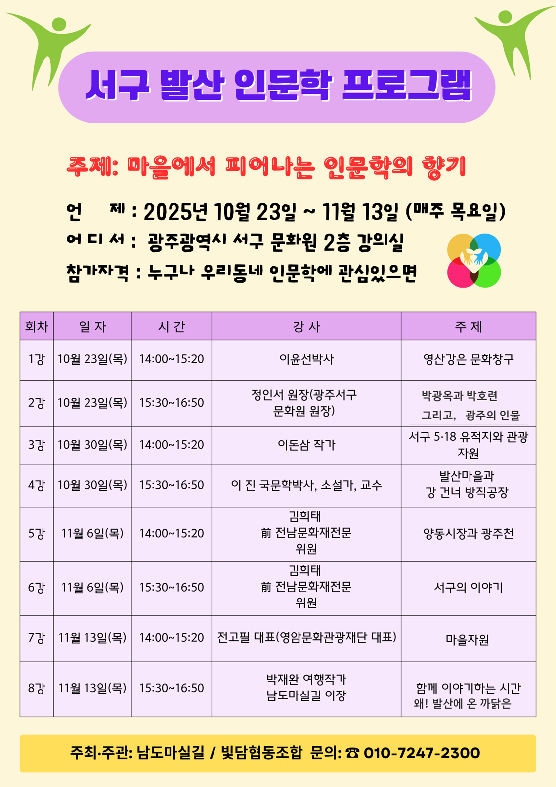 광주광역시 서구 발산마을에서 지역과 사람, 문화유산을 잇는 ‘서구 발산 인문학 프로그램’이 오는 10월 23일(목)부터 11월 13일까지 매주 목요일마다 개최된다. 이번 프로그램은 남도마실길과 빛담협동조합이 공동 주관하며, 발산마을과 주변 지역을 주제로 한 다양한 인문 강연이 총 8회에 걸쳐 진행된다.‘마을에서 피어나는 인문학의 향기’라는 주제로 진행되는 이번 인문학 프로그램은 우리 동네를 중심으로 문화, 역사, 예술, 인물, 공간, 유산을 통합적으로 탐색하며 지역민의 문화 감수성을 높이고, 마을에 대한 애착을 키우기 위해 기획되었다.강사진으로는 문화유산 전문가, 작가, 교수, 여행작가, 문화원장 등이 참여하며, ▲영산강 문화창구 ▲광주 인물 ▲서구 5·18 유적지 ▲발산마을의 근현대사 ▲양동시장과 광주천 등 주민이 공감할 수 있는 지역 밀착형 주제로 구성됐다. 강의는 광주 서구문화원 2층 강의실에서 진행되며, 지역 주민 누구나 무료로 참여 가능하다. 인문학에 관심 있는 주민이면 누구나 참여할 수 있어 지역 커뮤니티 강화와 인문 네트워크 형성에 기여할 것으로 기대된다.