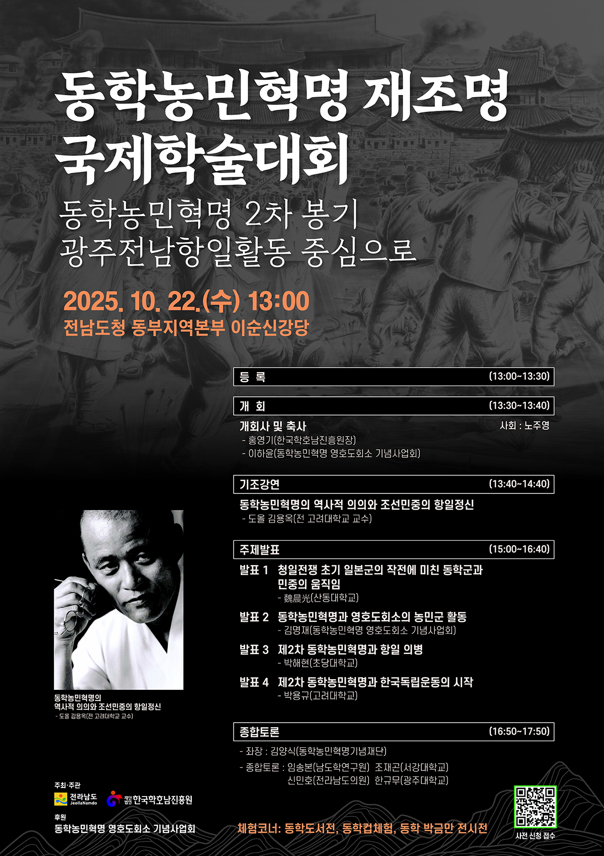 동학농민혁명의 역사적 가치와 광주·전남 지역 항일정신을 되짚는 뜻깊은 학술의 장이 열린다. 전라남도와 (사)한국학호남진흥원이 주최하고, 동학농민혁명 영호동회소 기념사업회가 주관하는 ‘동학농민혁명 재조명 국제학술대회’가 오는 10월 22일(수) 오후 1시, 전남도청 동부지역본부 이순신강당에서 개최된다.이번 학술대회는 ‘동학농민혁명 2차 봉기와 광주전남항일활동’을 중심 주제로, 민중의 항거와 자주정신이 어떻게 항일운동으로 확장되었는지를 집중 조명한다. 특히 동학농민혁명이 단순한 사회개혁운동을 넘어 민족독립의 불씨로 이어졌음을 학문적으로 새롭게 탐색하는 자리가 될 전망이다.기조강연에서는도올  김용옥 선생이 연단에 올라 “동학농민혁명의 역사적 의의와 조선민중의 항일정신”을 주제로 심도 있는 강연을 펼친다. 이어지는 주제발표에서는 ▲ 황풍년(산돌학교)이 ‘청일전쟁 초기 일본군의 작전과 동학군·민중의 움직임’을, ▲ 김영철(동학농민혁명 영호동회소 기념사업회)이 ‘영호동회소 농민군의 활동’을, ▲ 박해연(조선대학교)이 ‘제2차 동학농민혁명과 항일의병’을, ▲ 박두규(고려대학교)가 ‘제2차 동학농민혁명과 한국독립운동의 시작’을 발표하며 각자의 연구성과를 공유한다.마지막으로 진행되는 종합토론은 강임식(동학농민혁명기념재단)이 좌장을 맡고, 임승남(남도학연구원), 조계표(전남대학교), 신민호(전라남도의원)이 패널로 참여해 동학농민혁명이 남긴 항일정신의 계승과 현대적 의미를 심도 있게 논의할 예정이다. 또한 행사장 주변에서는 ‘동학도서전’, ‘동학컵체험’, ‘동학 박금만 전시전’ 등 다채로운 체험코너가 운영돼, 참가자들이 학문적 논의뿐 아니라 역사문화 체험의 즐거움도 함께 느낄 수 있는 시간이 될 것이다.