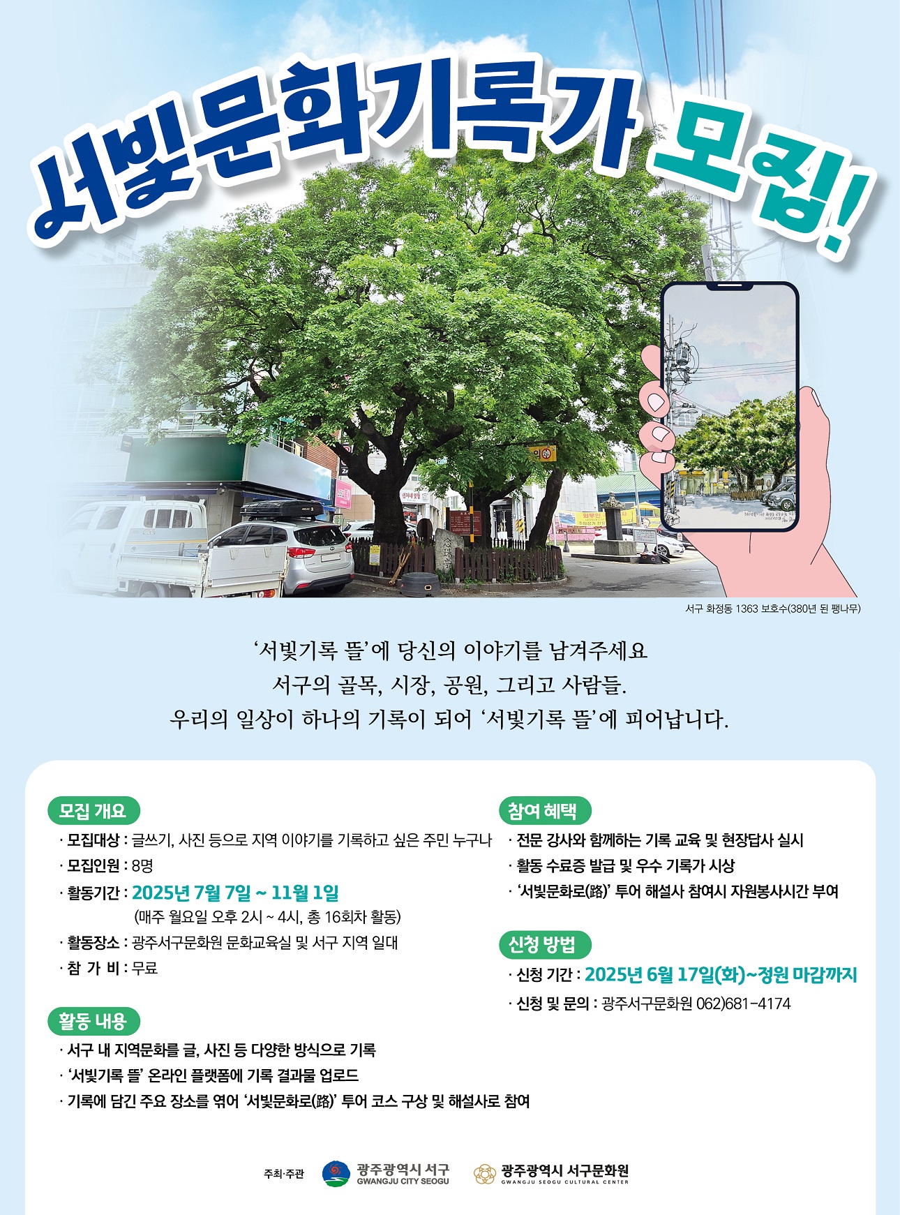 “주민과 함께 만드는 이야기 기록 프로젝트”서구문화원은 지역민과 함께 서구의 일상과 문화를 기록하는 아카이빙 프로젝트, ‘서빛문화기록가’를 운영하며, 이에 참여할 주민기록자를 공개 모집한다.‘서빛문화기록가’는 주민 스스로가 서구의 골목, 시장, 공원, 사람들에 얽힌 소소하고 따뜻한 이야기를 글쓰기, 사진 등 다양한 방법으로 기록하는 활동이다. 수집된 기록은 서구문화원 누리집 내 ‘서빛기록 뜰’에 업로드되며, 향후 지역 문화 해설 콘텐츠로도 연계될 예정이다.모집 인원은 8명으로, 지역 이야기를 기록하고자 하는 열정이 있는 주민 누구나 참여할 수 있다. 활동 기간은 2025년 7월 7일부터 11월 1일까지, 매주 월요일 오후 2시부터 4시까지 총 16회차 프로그램으로 진행된다. 서구 전역을 활동 무대로 하며, 서구문화원과 광주 서구의 주요 거점 장소에서 교육과 탐방이 함께 이루어진다.활동 참여자에게는 기록 전문가의 강의, 현장 기록 탐방, 개인 기록물의 누리집 업로드, 우수 활동가 시상, 그리고 기록을 기반으로 한 ‘서빛문화로(路)’ 해설사 참여 기회 및 자원봉사시간 인정 등의 혜택이 주어진다.특히 기록된 자료는 향후 서구문화원의 마을 해설 코스 개발에 활용되어, 단순한 기록을 넘어 서구의 살아있는 문화 자산으로 재탄생할 예정이다.서구문화원 정인서 원장은 “지역민이 주체가 되어 만드는 기록이기에 더 진정성이 있고, 서구의 삶과 풍경이 더욱 생생하게 담길 것으로 기대합니다. 많은 주민들이 함께 ‘서빛기록 뜰’의 첫 페이지를 채워주셨으면 좋겠습니다.”라고 전했다. 참여 신청은 2025년 6월 17일(화)부터, 전화(062-681-4174)로 접수하면 된다.