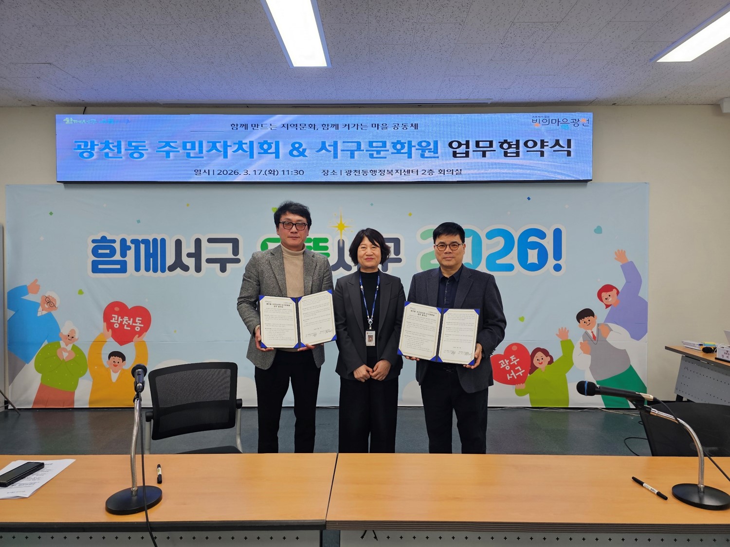 서구문화원-광천동 주민자치회 ‘맞손’, 지역 문화협력 본격화주민 중심 문화활동 확대, 문화인프라 공유로 시너지 기대 광주광역시 서구문화원과 광천동 주민자치회는 지난 3월 18일 광주 서구 광천동 행정복지센터에서 지역사회의 문화향유 기회를 확대하고, 주민 주도의 지역 공동체 활성화를 도모하기 위한 업무협약(MOU)을 체결하였다. 이번 협약은 서구문화원과 광천동 주민자치회가 긴밀한 협력 체계를 구축하여 주민의 문화적 삶의 질을 높이고, 다양한 인적·물적 교류를 활성화하기 위해 마련되었다.특히 광주서구문화원 정인서 원장이 광천동 주민자치회 위원으로 참여하고 있어, 양 기관 간 상호 이해를 바탕으로 실질적인 협력과 시너지 창출이 기대된다. 양 기관은 앞으로 정례적인 교류를 통해 상생발전을 도모하고, 지역 문화행사 개최 때 공동협력 및 프로그램 지원, 문화인프라의 상호활용 등 다양한 분야에서 협력을 확대해 나갈 계획이다.또한 이번 업무협약의 첫 협력 사례로, 오는 4월 4일부터 5일까지 이틀간 광주천변 일원에서 개최되는2026 힐링음악회 ‘새봄’ 광천동 무대에 서구문화원 하모니카 ‘소리빛’ 동아리가 참여해 공연을 선보일 예정이다. 앞으로 서구문화원과 광천동 주민자치회의 협력을 통해지역 주민들의 문화 향유 기회가 더욱 확대되고, 주민 주도의 문화공동체가 활성화되는 의미 있는 성과로 이어지길 기대한다.