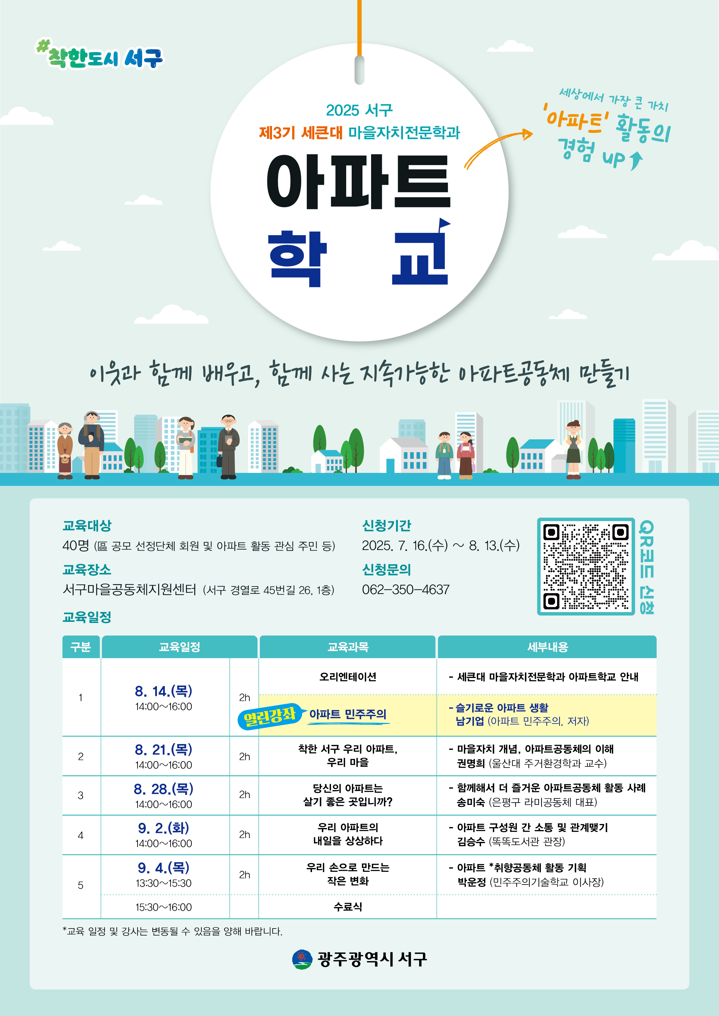 - 2025 서구 제3기 아파트학교, 공동체의 시작을 알리다광주광역시 서구는 오는 8월 14일부터 9월 4일까지, 이웃과 함께 배우고 실천하며 지속가능한 아파트 공동체를 만들어가는 ‘2025 제3기 아파트학교’를 운영한다.‘아파트학교’는 세큰대 마을자치전문학과의 일환으로, 공동주택 거주 주민들의 자발적인 참여와 공동체 활동 역량 강화를 목표로 하는 교육 프로그램이다. 교육은 서구마을공동체지원센터에서 총 5회차에 걸쳐 진행되며, 아파트 활동에 관심 있는 주민 또는 공모 선정을 통해 구성된 단체 회원 등 총 40명을 모집한다.이번 교육에서는 ▲슬기로운 아파트 생활과 민주주의, ▲마을자치와 아파트 공동체 이해, ▲입주민 간 소통과 관계 맺기, ▲실제 아파트 공동체 활동 사례 등 공동체를 구성하고 운영하는 데 필요한 핵심 주제들을 다룰 예정이다. 또한 교육 마지막에는 참여자들의 실천 아이디어를 공유하는 수료식도 함께 진행된다.특히 강사진으로는 『슬기로운 아파트 생활 남기일』 저자, 주거환경학과 김명희 교수, 은평구 사례 활동가 등 이론과 실천을 겸비한 전문가들이 대거 참여하여 실질적인 역량 향상을 도울 예정이다.신청 기간은 7월 16일부터 8월 13일까지이며, QR코드 접속 또는 서구마을공동체지원센터(062-350-4637)로 문의하면 신청할 수 있다.