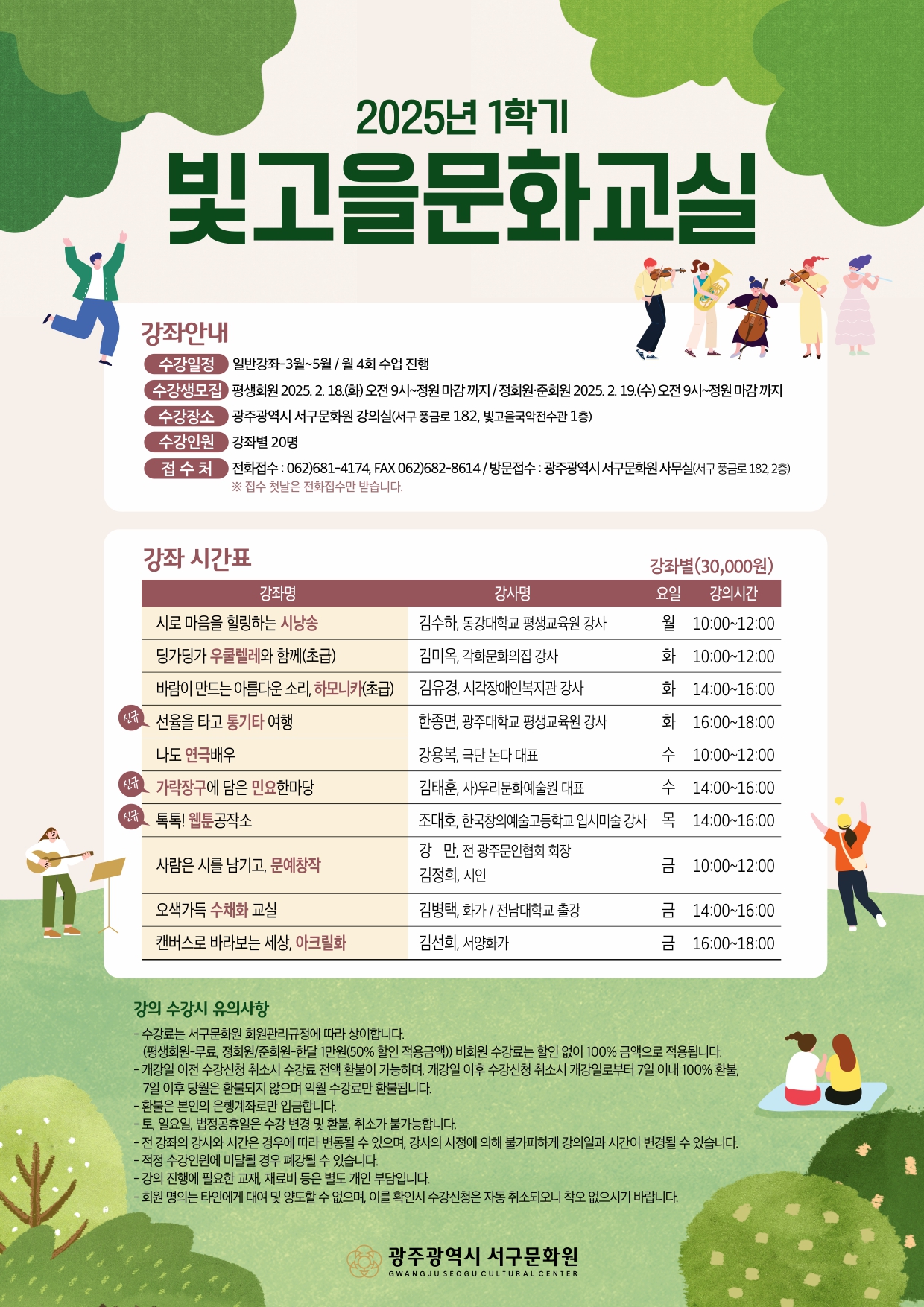 다양한 문화예술 교육프로그램을 통해 지역주민의 문화 향유와 생활문화의 일상화, 문화인식의 새로운 기회를 제공하며 지역민간의 인적 교류를 통해 삶의 질을 향상하도록 노력하고 있다. 지역 내에서 가장최고의 강사진과 가장 저렴한 수강료로 인문학적 소양을 쌓을 수 있는 장을 만들고 있다. 특히 문화교실 수강생들이 강의를 통해 배운 다양한 역량을 발표할 수 있는 무대를 만들어 참여의 자긍심을 갖게 하고 있다.