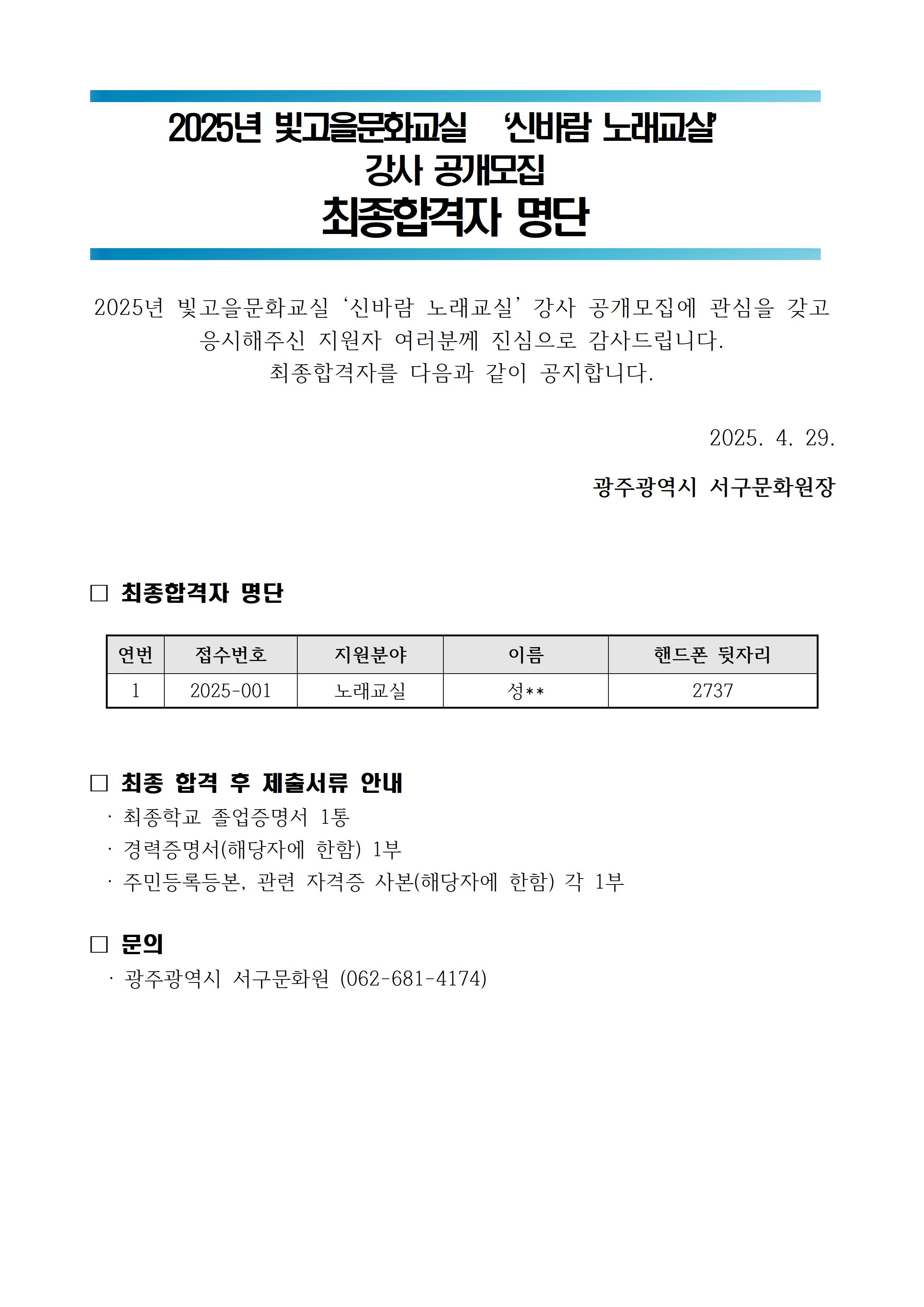 2025년 빛고을문화교실 '신바람 노래교실' 강사 공개모집 최종합격자 공지