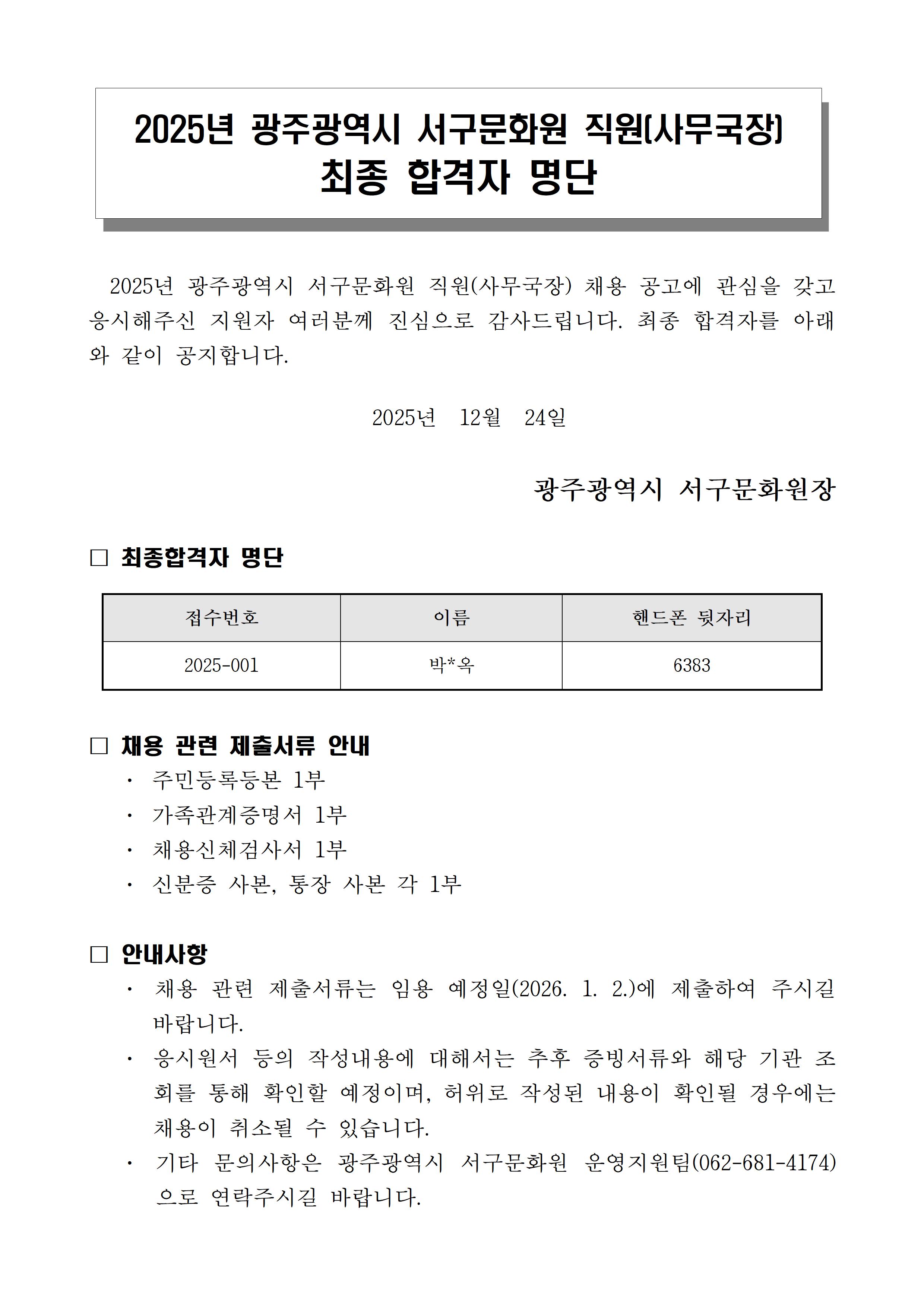 2025년 광주광역시 서구문화원 직원(사무국장) 최종 합격자 발표
