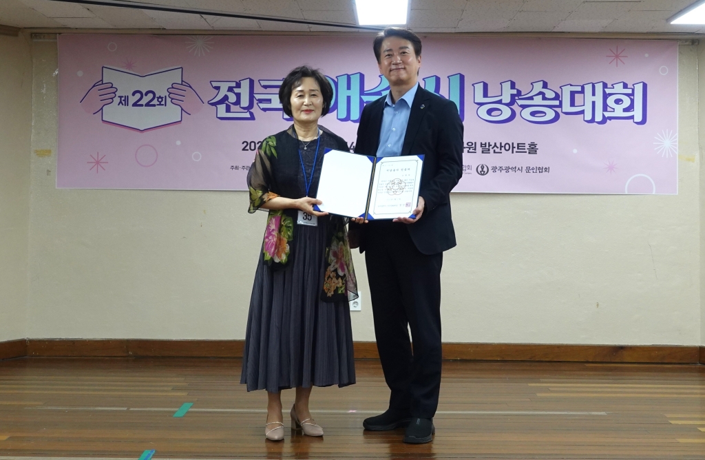 시와 낭송의 아름다움이 광주 서구를 물들였다. 지난 6월 27일(금)  광주 서구문화원 발산아트홀에서 열린 ‘제22회 전국 애송시 낭송대회’가 성황리에 막을 내렸다. 이날 대회에서는 문병란 시인의 '바다가 내게'를 탁월하게 낭송한 충남 아신 출신의 노경임 씨가 대상 수상의 영예를 안았다.*제22회 전국애송시낭송대회에서 대상을 수상한 노경임씨에게 김이강 서구청장이 수상 이후 사진을 함께 했다.광주광역시 서구청과 서구문화원이 주최·주관하고 한국문화원연합회, 광주광역시 문인협회가 후원한 이번 대회는 전국 각지의 시 낭송 애호가들이 한자리에 모여 우리말의 아름다움과 시의 감동을 나누는 문학 축제의 장이었다. 정서 함양과 문학적 감수성 증진을 목표로 매년 개최되는 이 대회는 전국 단위의 권위 있는 문학 행사로 자리매김하고 있다.예선을 거쳐 본선에 진출한 40명의 참가자들은 각자 준비한 시 한 편을 낭송하며 저마다의 해석과 감성을 무대에 펼쳐냈다. 참가자들의 진심 어린 낭송은 현장을 찾은 관객들에게 깊은 울림과 감동을 선사하며 뜨거운 박수갈채를 받았다.이번 대회의 최고 영예인 대상은 노경임 씨에게 돌아갔다. 노 씨는 뛰어난 발성과 시에 대한 탁월한 감정 전달력을 높이 평가받아 상금 100만원과 서구청장상을 수상했다.이 외에도 빛나는 수상자들이 대회를 더욱 풍성하게 만들었다. △금상은 이근배 시인의 ‘금강산은 길을 묻지 않는다’를 낭송한 경남 창원의 하종분 씨가, △은상은 공광규 시인의 ‘얼굴반찬’을 낭송한 경북 안동의 김용섭 씨와 이용악 시인의 ‘두만강 너 우리의 강아’를 낭송한 전남 목포의 백성숙 씨가 각각 수상의 기쁨을 누렸다.이밖에도 동상 10명은 전남 나주의 김용갑, 광주의 박연식, 김인자, 공난숙, 기미란, 나숙희와 전남 광양의 김정옥, 인천 부평의 왕미희, 충남 서천의 홍경숙, 경기도 의정부의 김기래 등이 골고루 배출됐다.이날 시상식에 참석한 김이강 광주 서구청장은 “시를 통해 시민이 정화되고 공감하는 이 대회는 광주의 중요한 문화자산”이라며, “앞으로도 낭송 문화를 통해 따뜻한 공동체를 만들어 나가겠다”고 밝혔다.김종 심사위원장은 “시 낭송은 단순한 낭독을 넘어, 감정과 언어의 예술적 소통”이라며, “이번 대회를 통해 시민들이 문학에 한 걸음 더 다가서는 계기가 되기를 바란다”고 전했다.이날 경연대회에는 이근모 광주문인협회장, 강만 전 광주문인협회장, 전숙 백호임제문학상 수상자 등 내빈들과 광주 시민 및 문화원 회원들이 참석하여 자리를 빛냈다. 시의 아름다움과 감동을 나누는 축제의 장이 된 이번 대회가 지역 문화 발전에 더욱 기여할 것으로 기대된다.