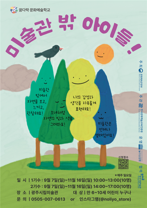 가을 햇살이 따뜻하게 내리쬐는 9월, 광주시립미술관이 어린이들을 위한 특별한 예술 놀이터를 열었다. 이름하여 〈미술관 밖 아이들!〉. 이번 프로그램은 그림만 보는 미술관이 아니라, 자연과 예술을 직접 몸으로 느끼고 놀 수 있는 공간으로 꾸며졌다.9월 7일부터 11월 16일까지 매주 일요일, 모두 16번에 걸쳐 미술관 마당과 정원, 그리고 전시실 일부는 아이들의 웃음소리로 가득할 예정이다. 프로그램은 생태예술단체 ‘놀이요점빵’과 함께 기획되었다.아이들이 나뭇잎을 만지고 흙냄새를 맡으며 예술과 자연을 동시에 체험할 수 있도록 구성되었다. 단순히 그림을 그리거나 작품을 보는 데서 그치지 않고, 스스로 놀이 속에서 예술을 발견하는 방식이다.이 활동은 문화체육관광부와 한국문화예술교육진흥원이 지원하는 ‘꿈다락 문화예술학교’ 사업에 선정되어 더욱 알차게 운영된다. 아시아예술정원, 생태예술놀이터, 어린이미술관 등 다양한 공간이 무대가 되어, 도심 속에서도 숲속에 있는 듯한 체험을 가능하게 한다.아이들은 기수별 10명씩 모집되며, 만 6세에서 10세 사이의 어린이라면 누구나 참여할 수 있다. 오전과 오후 두 차례 나누어 운영되므로, 더 많은 친구들이 함께 어울릴 수 있다.윤익 광주시립미술관장은 “미술관은 단순히 전시를 보는 곳이 아니라, 아이들이 삶 속에서 예술을 즐길 수 있는 배움터가 되어야 한다”며 “앞으로도 지역 단체와 힘을 모아 더 많은 현장형 프로그램을 만들겠다”고 말했다.이번 프로그램은 지난 6월 국립아시아문화전당과 협업한 〈아시아의 자연과 정원〉의 성공적인 경험을 바탕으로 기획되었다. 협력과 나눔 속에서 완성된 프로그램인 만큼, 아이들은 더 풍성한 경험을 하게 될 것이다.도심 속 미술관이 열어주는 자연의 놀이터, 〈미술관 밖 아이들!〉. 가을의 주말마다 아이들은 그림자가 긴 나무 아래에서, 바람에 흔들리는 풀잎 사이에서, 그리고 색색의 물감과 함께 예술의 즐거움을 한껏 느낄 수 있을 것이다.