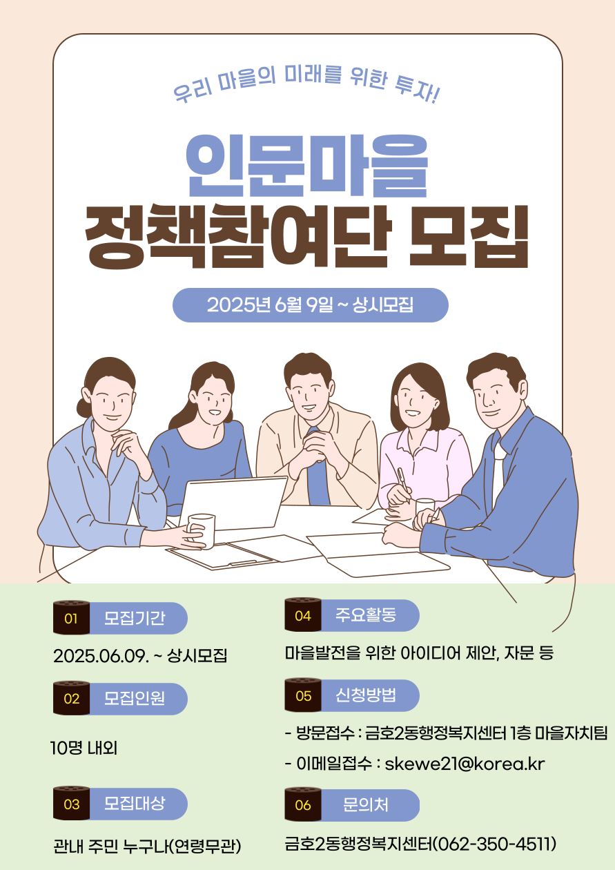 - 광주광역시 서구 금호2동 행정복지센터에서는 2025년 6월 9일부터 ‘인문마을 정책참여단’을 상시 모집한다. 이번 사업은 주민이 직접 마을 정책에 참여하고, 생활 속 아이디어를 제안할 수 있는 주민참여형 거버넌스 프로그램으로, 우리 마을의 미래를 위한 투자라는 슬로건 아래 추진된다.정책참여단은 금호2동 관내 주민이라면 연령 제한 없이 누구나 참여할 수 있으며, 10명 내외로 구성될 예정이다. 주요 활동으로는 마을 발전을 위한 아이디어 제안과 정책 자문, 생활현장의 의견 수렴 등이 있다.신청은 금호2동 행정복지센터 1층 마을자치팀을 방문하거나, 이메일(skew2e21@korea.kr)로도 접수 가능하다. 관련 문의는 금호2동 행정복지센터(062-350-4511)로 하면 된다.