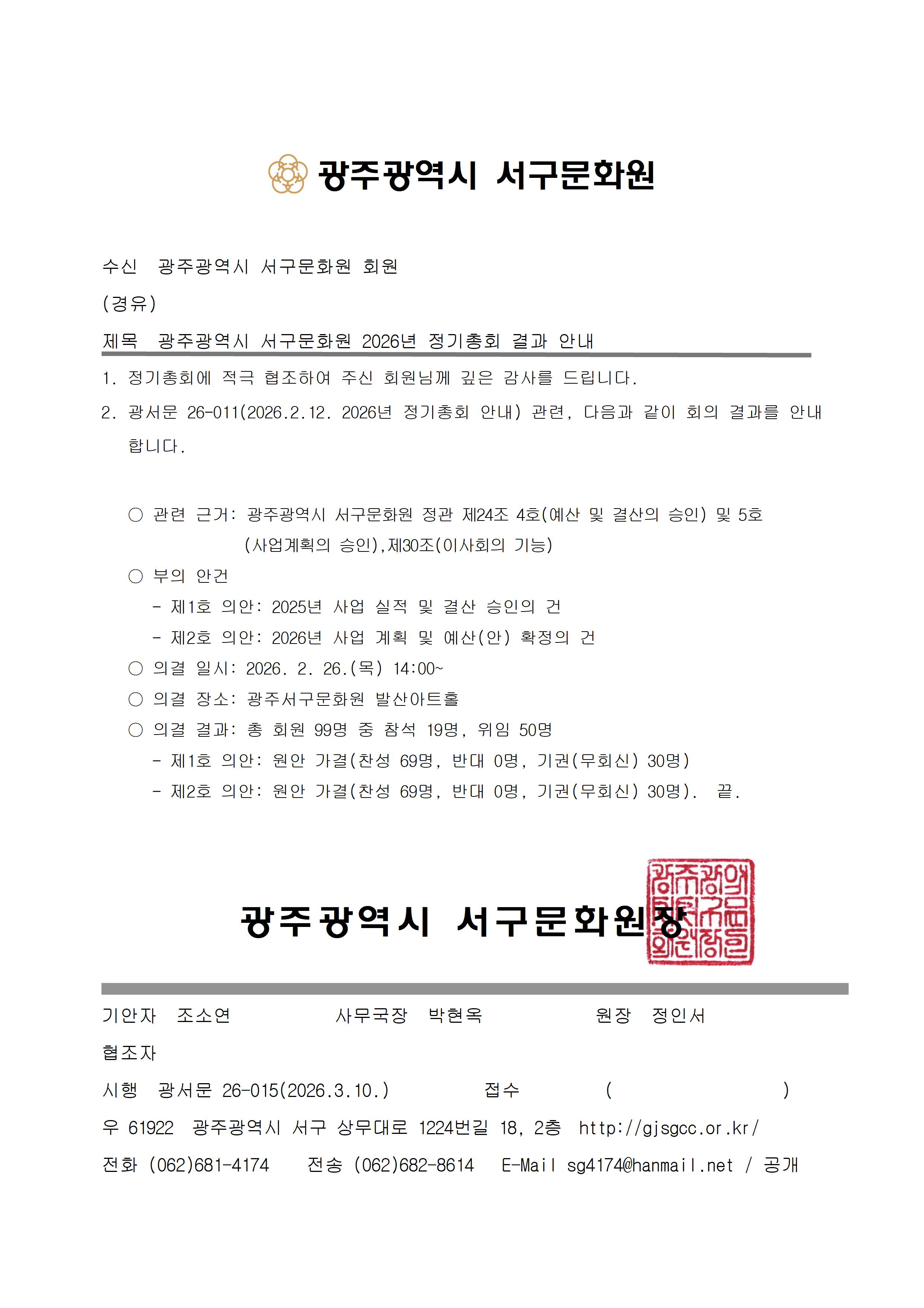 광주광역시 서구문화원 2026년 정기총회 결과 안내